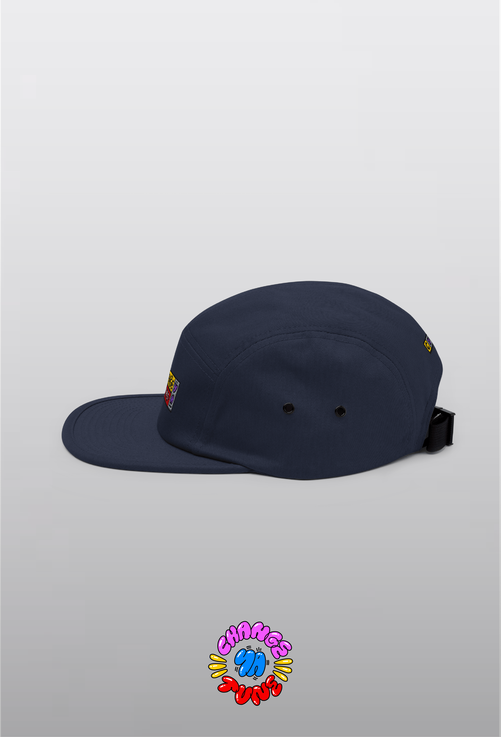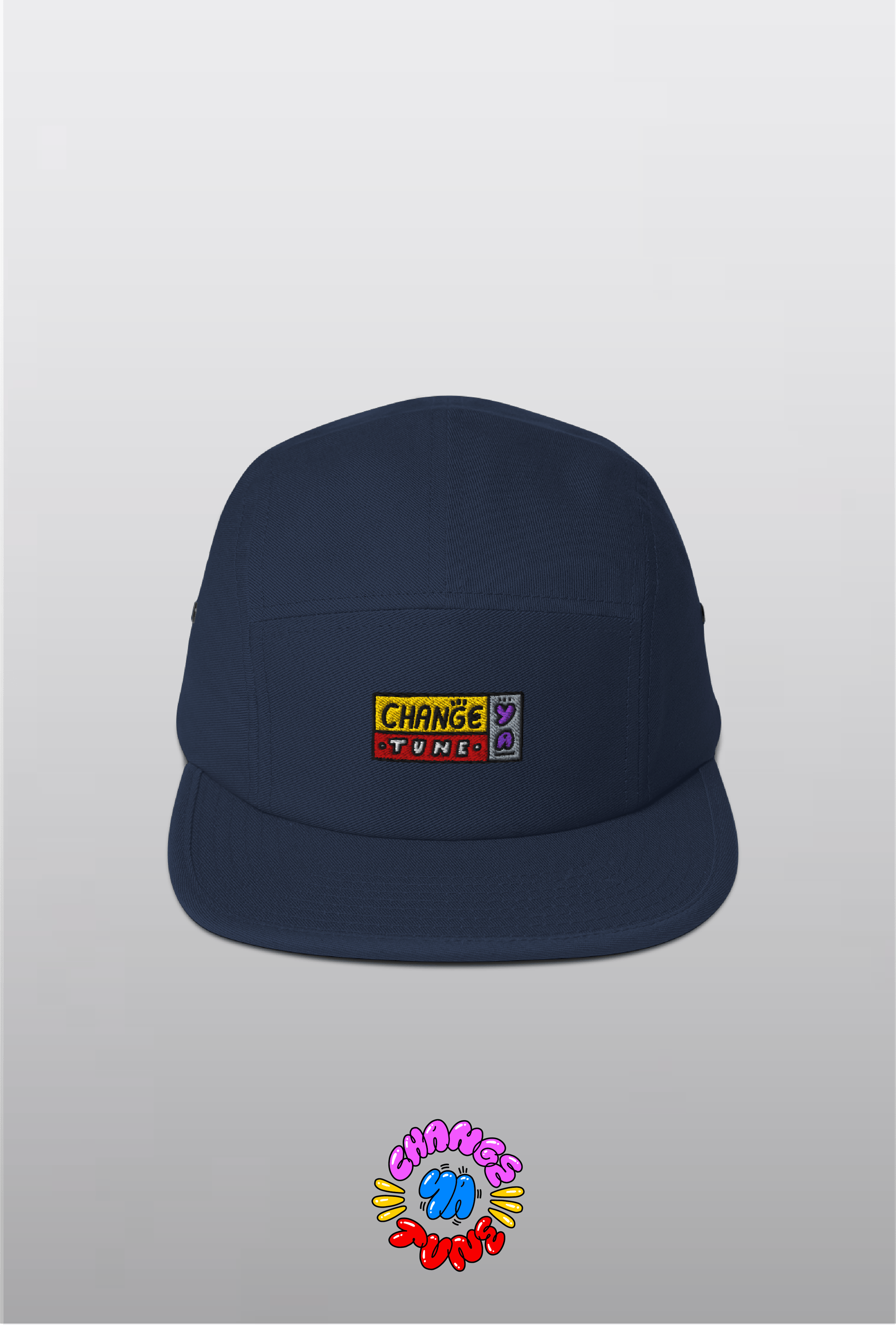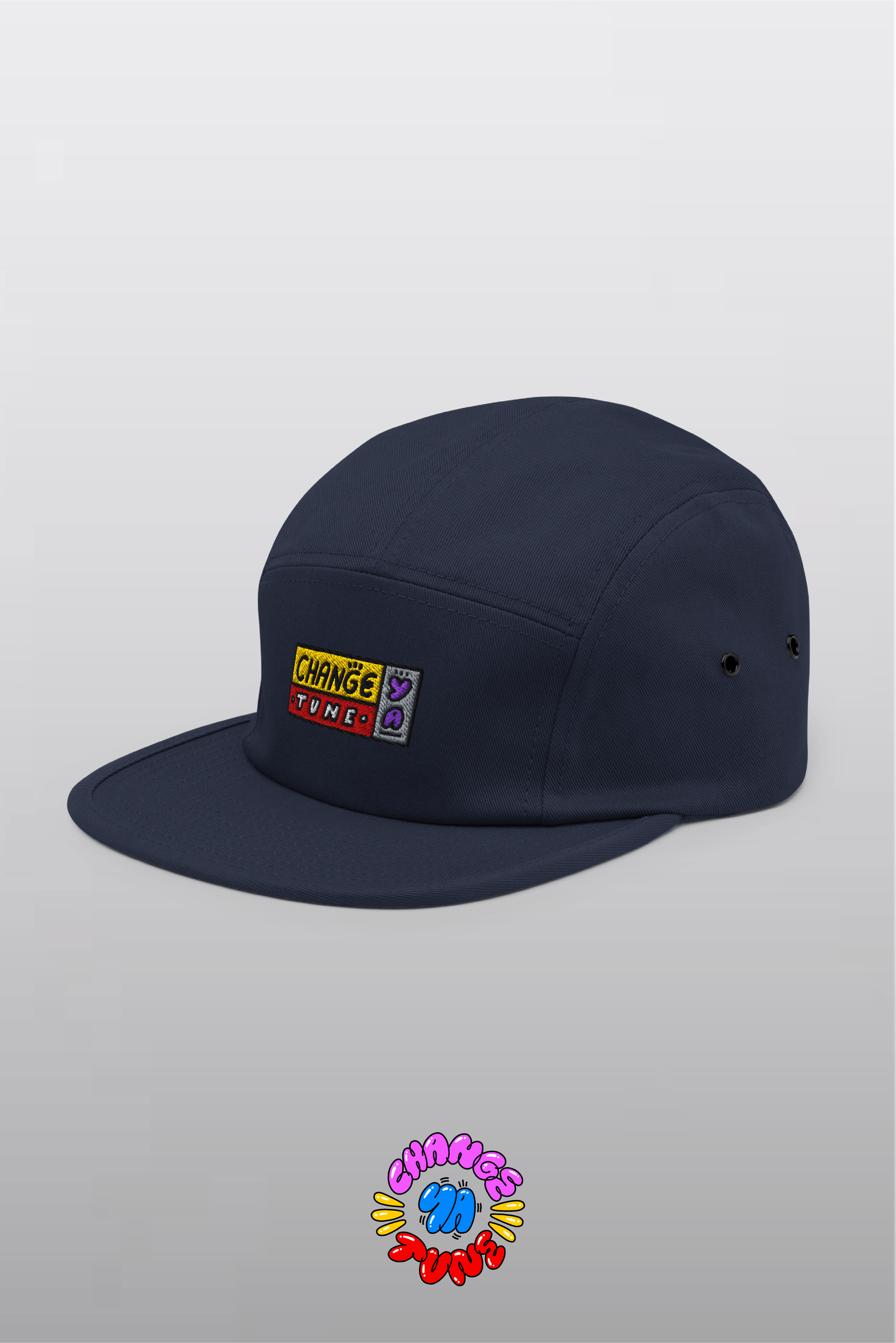 A low-profile navy 5-panel built from soft 100% cotton. The front lands with a bold, block-colour embroidered Change Ya Tune mark, while the back carries a matching C.Y.T trio hit. Metal eyelets on the sides keep it breathable, and the nylon strap clip locks in the fit. Simple shape, bright marks — an easy everyday cap.