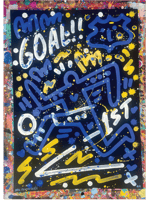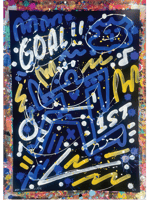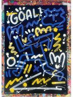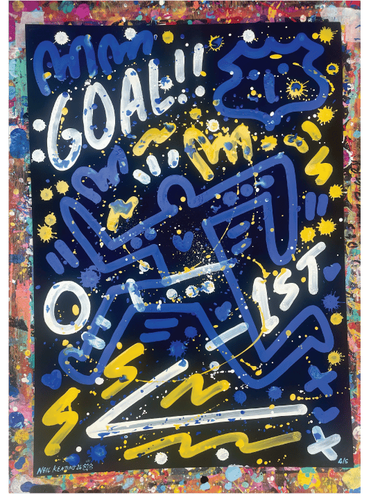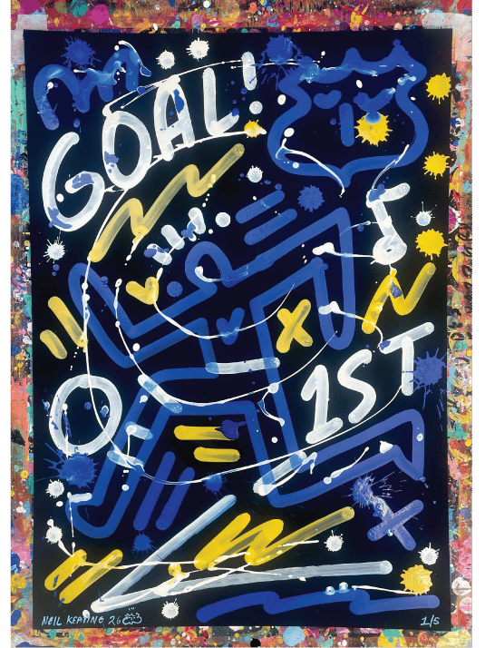 Part of the Goal Series within the Neil Keating Everton Collection, this is a small original artwork painted in free-flowing style on A2 black card in the royal blue, white & yellow of Everton FC. Each piece shares the same core design elements but as original paintings no two are identical.